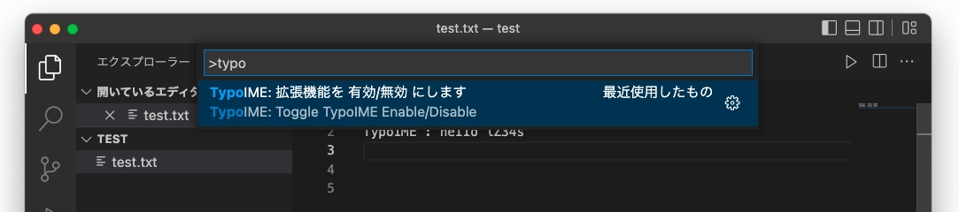 有効化にはコマンドを使います。Shift+Command/Ctrl+Pでコマンドパレットを開いてください。その後、TypoIME: Toggle TypoIME Enable/Disableを選択してください。これにより、拡張機能が一時的に有効になります。