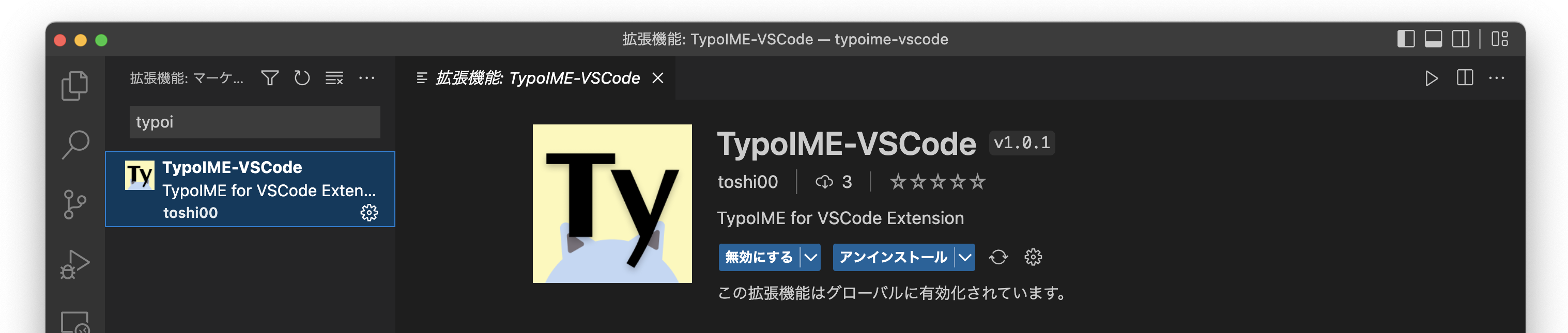 VSCodeを閉じると、有効化したTypoIME-VSCodeも自動的に無効となるので、わからなくなっても安心です。