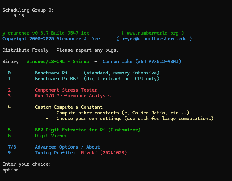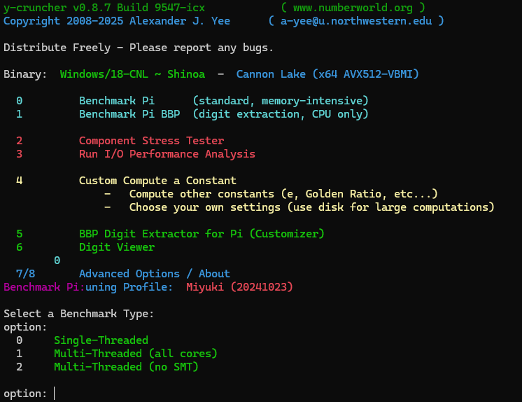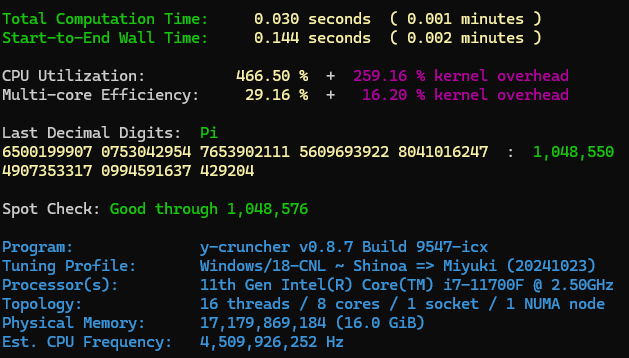 y-cruncherというソフトがあります。ここからダウンロードすることが出来ます。簡単に説明すると、マルチスレッドに対応した計算プログラムです。今年の12月11日に、円周率が314兆桁計算されたというニュースがありましたが、この計算にも使われています。ちなみに、使用しているアルゴリズムや、公式は先程紹介したChudnovskyの公式とBinary Splitting Methodです。