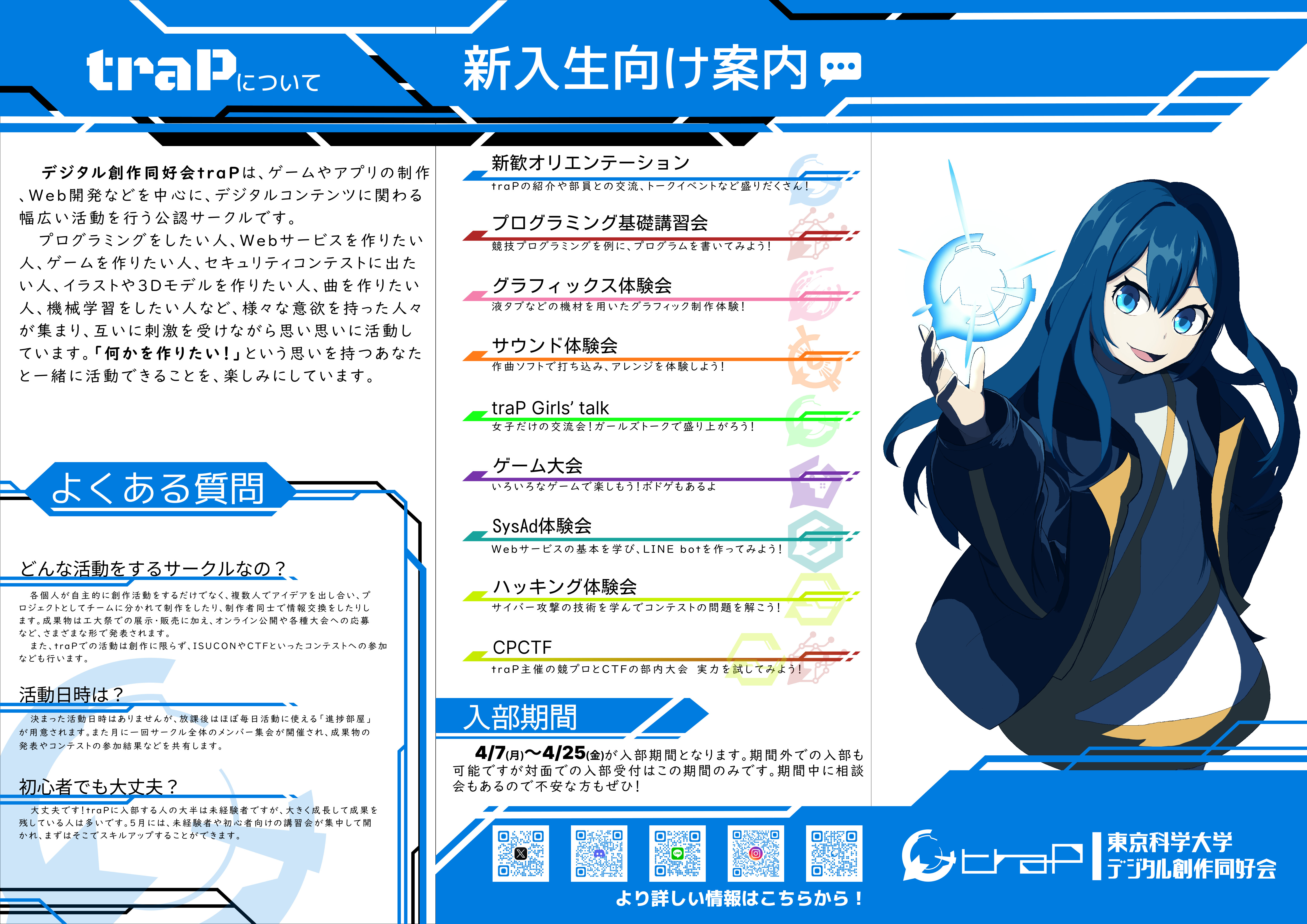 この記事は新歓ブログリレー2025 50日目の記事です。 この記事が新歓ブログリレー2025の最後の記事になります。 部員が様々な記事を書いてくれましたが、いかがでしたでしょうか?楽しんでいただけたなら幸いです。 入部期間は終わってしまいましたがオンラインの入部はいつでも受け付けているので、入部希望の方はこちらの記事のオンライン入部を参考に手続きを行ってください。 2025年度 traP入部の手引き今年度のtraPへの入部方法を説明します。 尚、過去にtraPに所属していて再度入部を希望する場合は、入部手続きではなく再入部手続きを行うので、こちらのGoogleフォームの「再入部受付」からご申請ください。 また、traPでは入部期間以外でも入部を受け付けています。入部期間外に入部を希望する方も、こちらのGoogleフォームの「新規入部受付」からご申請ください。 入部条件 * 東京科学大学・大学院に在籍していること ※科目等履修生、三大学連合の学生なども、東京科学大学に在学していることの証明(東京科学大メールアドレスの所持証明、学生証の提示、在学証明書の提示のいずれか)ができ
