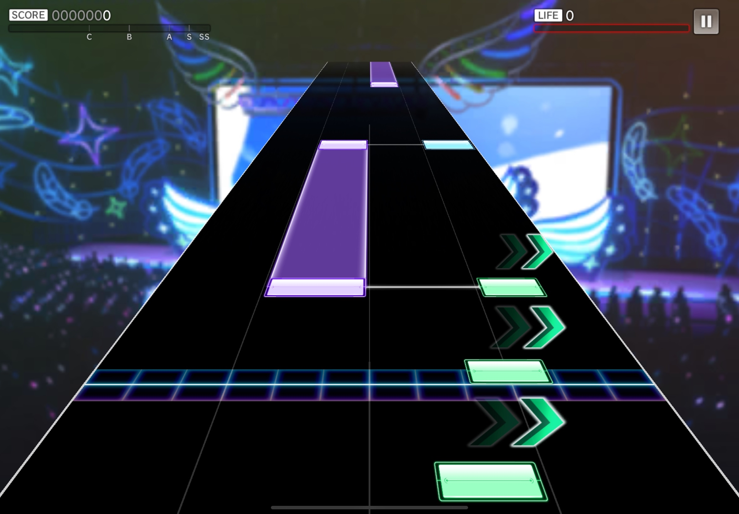 ゲームのシステムとしては、単純に上から降ってくるノーツに合わせてタップしたり長押ししたりする、よくあるタイプのスマホ向け音ゲーです。