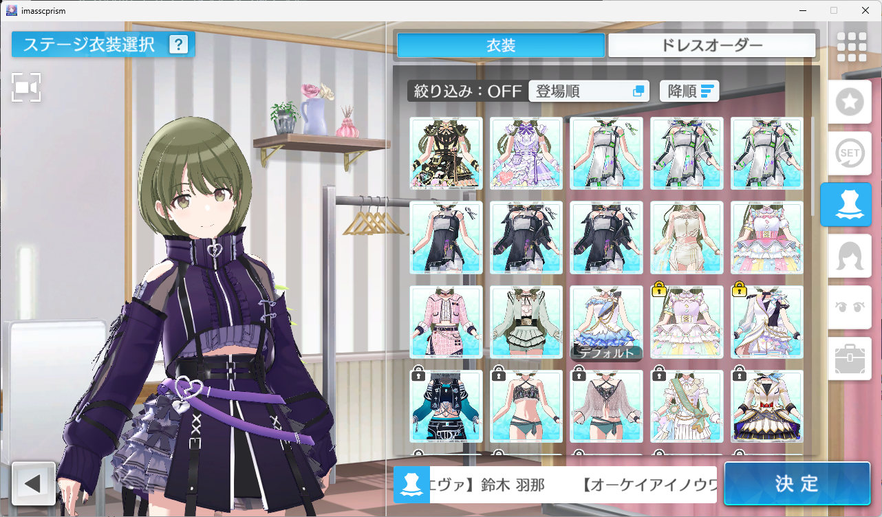また、この画面では所持してない衣装でも自由に着せ替えて似合ってるかどうか見ることができます。ここで†最強の組み合わせ†を探すだけで無限に時間が過ぎていきます。