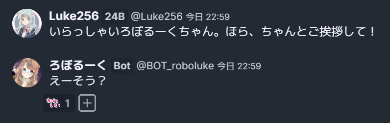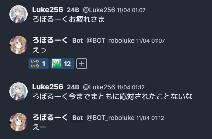 ところで、ろぼるーくはそもそもチャットBOTで、他の人の発言に反応して発言します。一応コマンドに対しては反応しないようにしていますが、連絡などをすると反応してしまうことがあります。運用中もちょいちょいしゃべっていました。(反応確率は5%なのに、僕のほぼすべての発言に反応してきました...なにがあった)