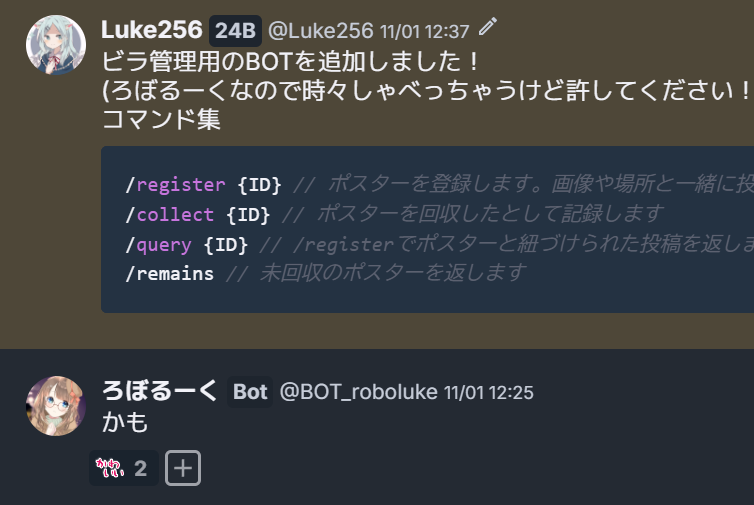 事の始まりは工大祭準備日。ちゃんとポスター管理しないとなぁと思いながら部室でレンタルPCの到着を待っていました(このPCの納品書が入った箱が途中で配送止まっていて丸一日潰れたという話はまた今度)。こうしたツールを作るとき、最も手っ取り早い方法はDiscordBOTのようなチャットツールのBOTとして実装することです。通常ツールの作成は裏のロジックと表のUI作成が必要ですが、BOTはUI部分をすっ飛ばしてくれるからです。便利。