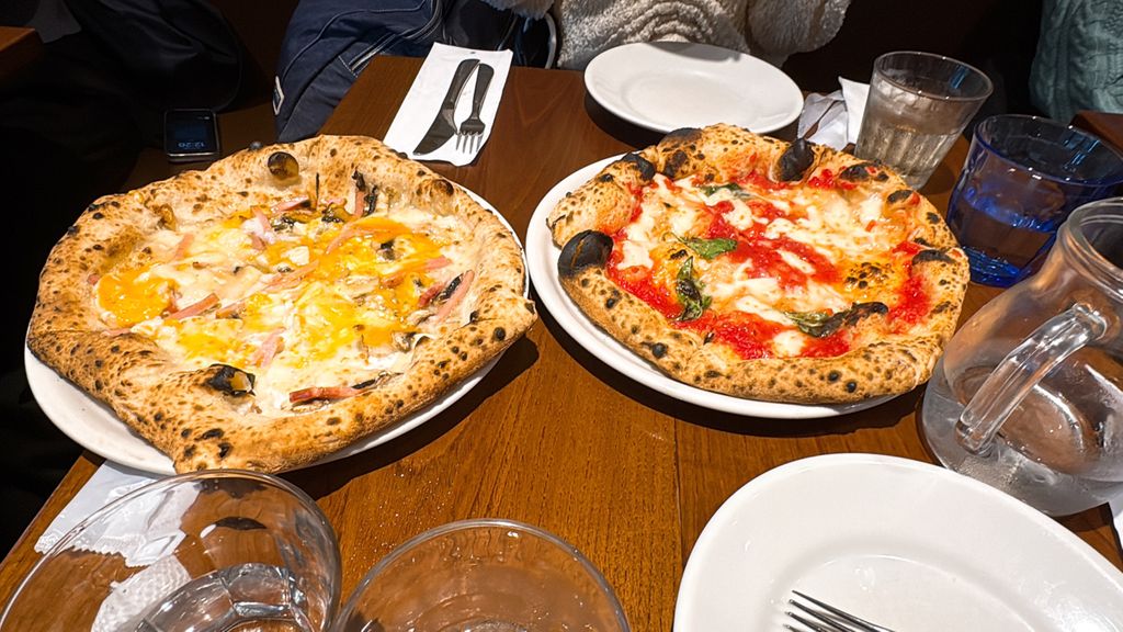 この日はお昼に行きました。お昼のセットではピザ一枚とサラダ、ティーが付いて来ました。ピザは一枚一枚店内の窯で焼いていて、焼きたてがいつでも食べられます。写真は左がビスマルク(多分)と右がマルゲリータです。生地がもちもち柔らかくて、食べるというかもはや飲めるという感覚に近いです。店内は数々の大会で優勝した時のトロフィーがずらり。
