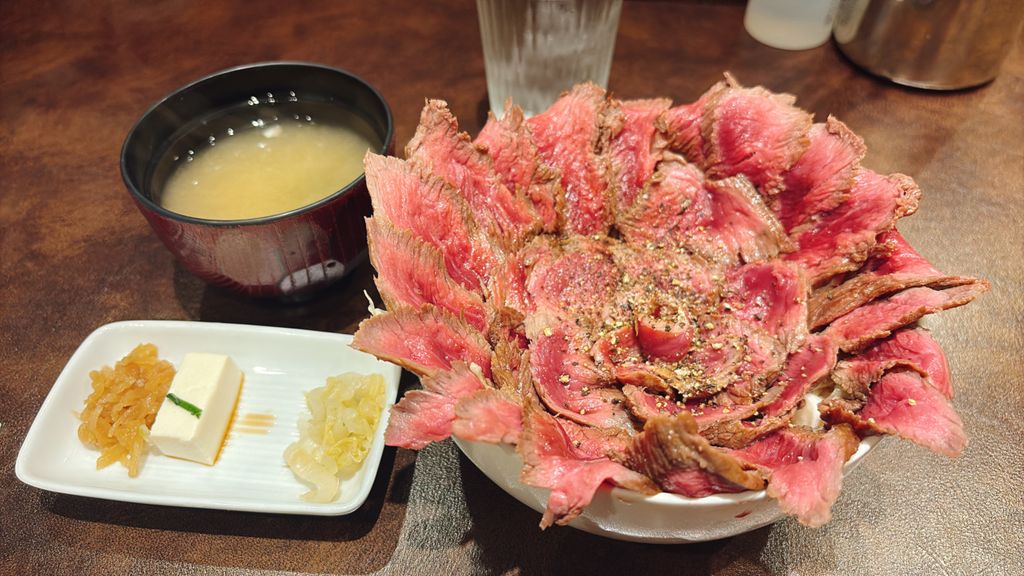 ローストビーフ丼のインパクトがすごいです!柔らかくてちょうどいい火加減で美味しかったです。写真では一番小さいサイズを注文しましたが、大盛りにも対応しています。お新香とお味噌汁もついて来て、心が温まる感じがします。ローストビーフ丼の他にもハンバーグやチキン南蛮なども注文できます。お店の場所が一度変更になったそうなので、初めて訪れる時は注意が必要です。