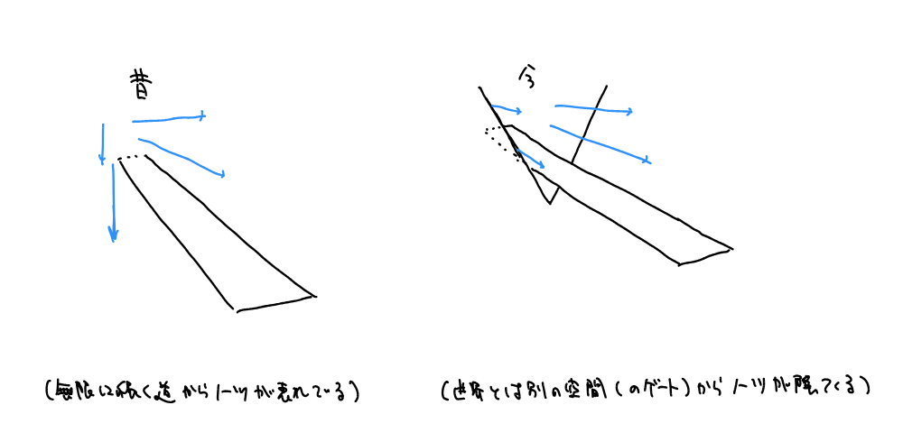 これにより、副次的効果ではあるものの、ノーツが生まれてくる場所が、三角形のゲートの先にあるような、背景とその向こう側とを隔てるような表現になっているというのは面白いですね。(たぶんそう考えてる人あんまりいない)