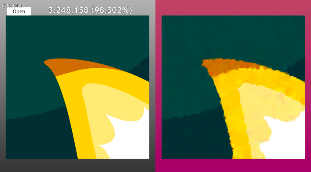 このアプリはランダムな場所に特定の図形などを描画しながら、お手本画像に似せていくということをします。こちらは前半よりもかなりアレンジが多彩で、別のサンプル画像で試したり、描画する図形を自分で追加実装してみたりした人がたくさんいました。