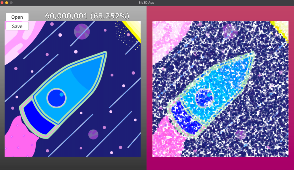 後半では、Siv3D を使って画像処理を行い、C++の強みである軽量さを体験しました。コースでは、事前に用意したサンプル画像に対して、それに似せた絵をリアルタイムで描いていくアプリを実装しました。