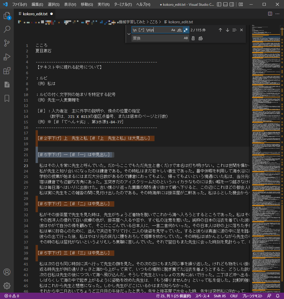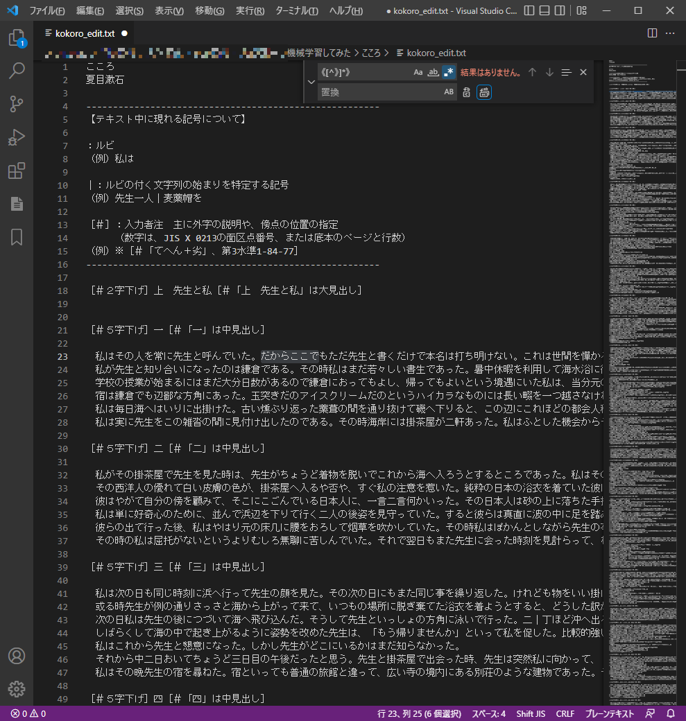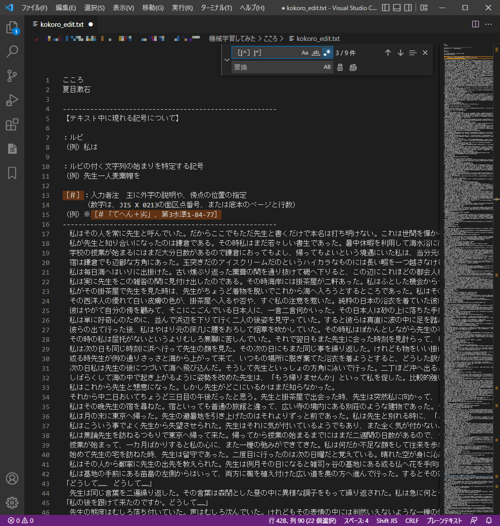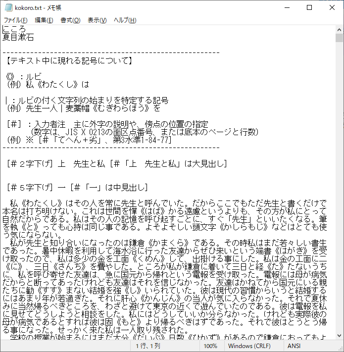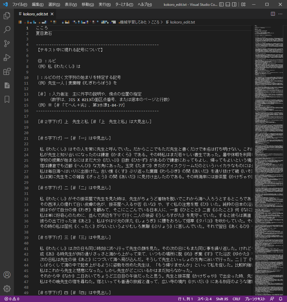 1. kokoro.txtをコピーし、kokoro_edit.txtを作成する