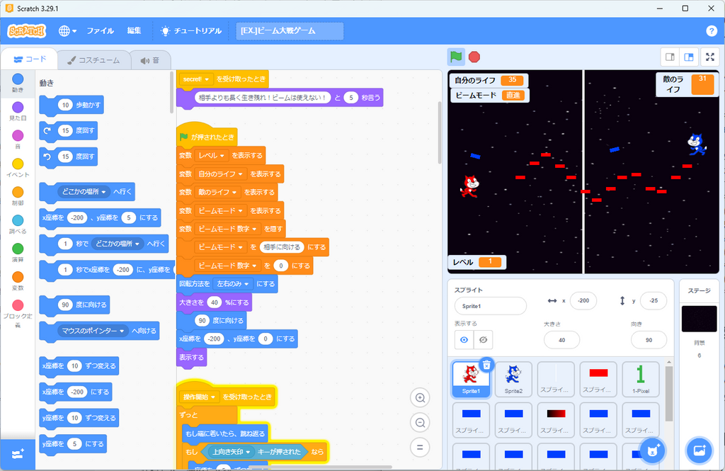 今回のゲームにおけるゲームシステムは単純で、相手からのビームをよけながら、自分のビームで相手を倒す、というあるあるなものです。