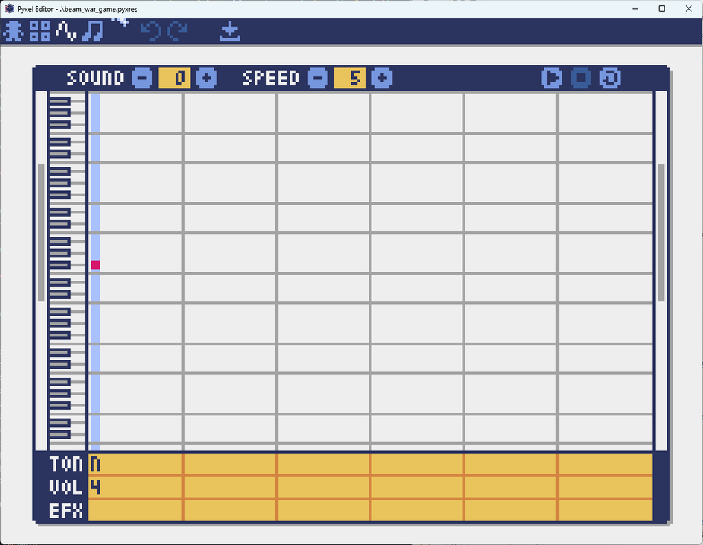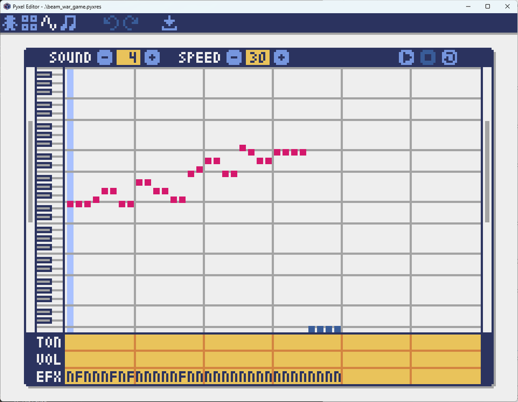 また、ビームを打つ間隔も、Scratchでは秒数で管理していましたが、この部分はpyxelに移植するにあたり大幅に修正しました。