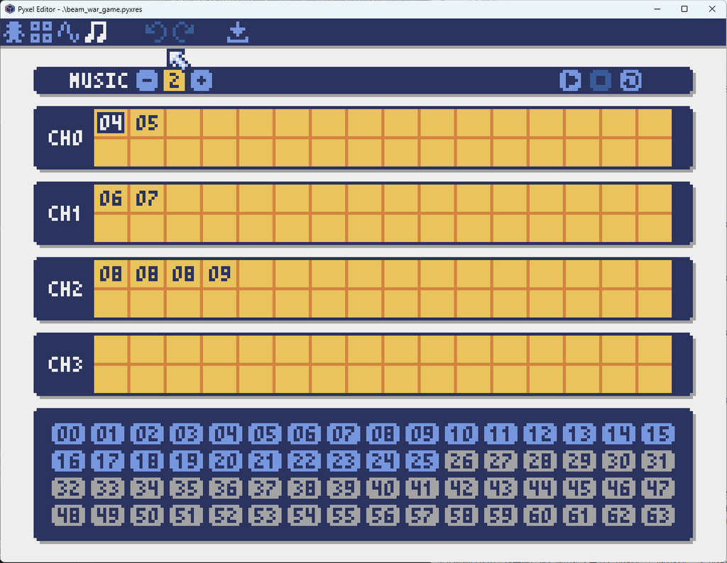 チャンネルは4つなので、今回は音楽はch0~2を、SEはch3を使用しています。