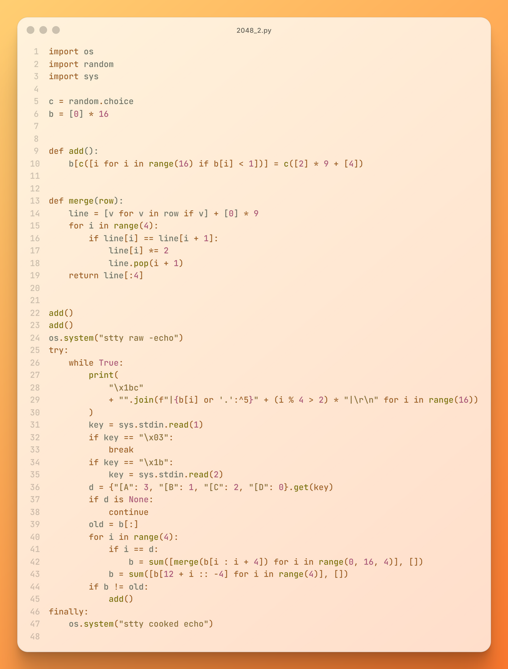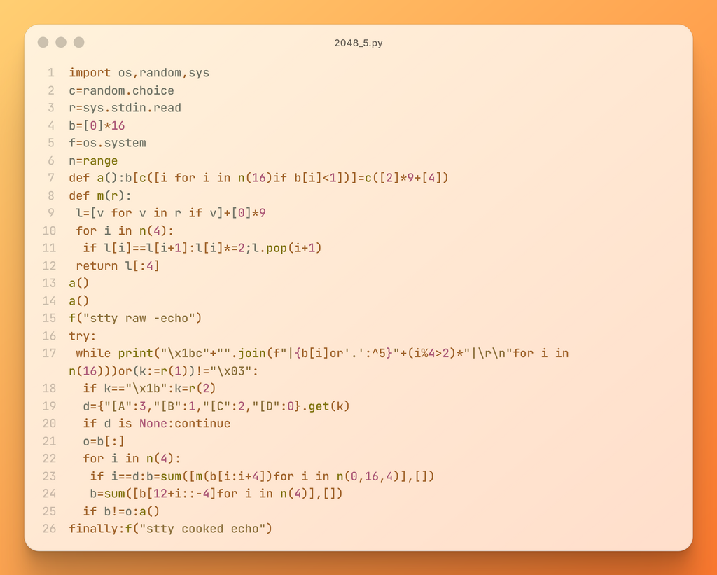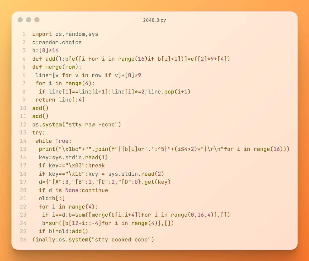 ![c = random.choice def add(): b[c([i for i in range(16) if b[i] < 1])] = c([2] * 9 + [4])](https://trap.jp/content/images/2026/03/add.png)
