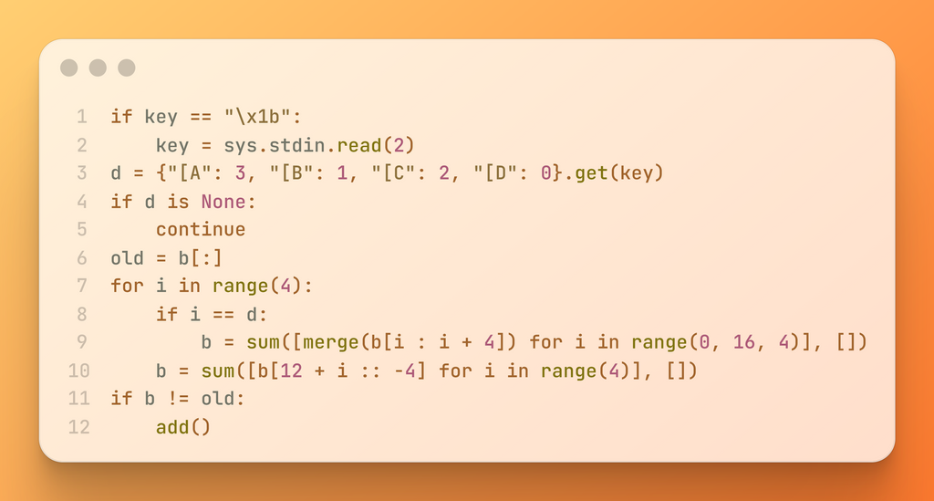 ![def merge(row): line = [v for v in row if v] + [0] * 9 for i in range(4): if line[i] == line[i + 1]: line[i] *= 2 line.pop(i + 1) return line[:4]](https://trap.jp/content/images/2026/03/merge.png)