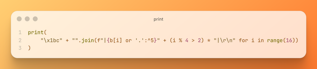 495bytesになりました。n(4) をさらに共通化させるのと、\x1b を1文字にまとめるのとで短縮しています。500を切ったのでひとまず満足ですね。ここからさらに短くするなら何かしらimportを一つ消したり等号をうまく言い換えたりする感じかと思います。もしくは Ctrl + C で止まらなくするような仕様を短縮しやすいものに変えるという方法もありそう。