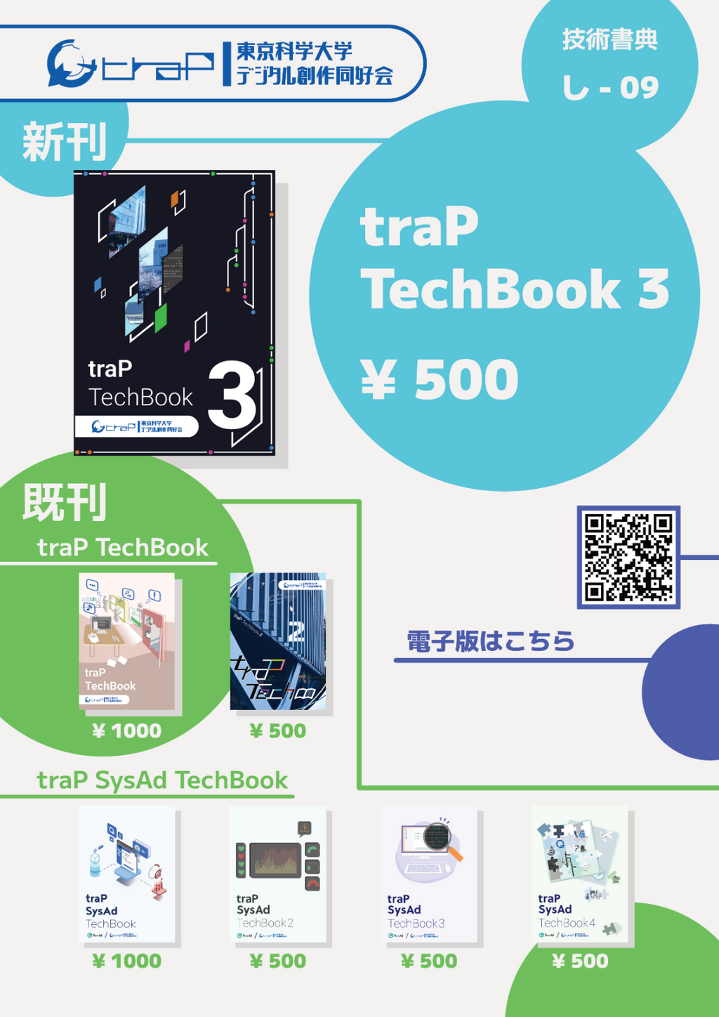 「traP TechBook 3」はSysAd班に絞ることなく、traP内から広く技術的なテーマを集めた内容となっております!ぜひこの機会にお買い求めください!