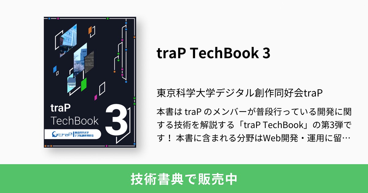 本書は traP のメンバーが普段行っている開発に関する技術を解説する「traP TechBook」の第二弾です!本書に含まれる分野は Web や開発にのみならずプロトコル、更には音楽まで幅広く、それぞれで執筆者たちが面白いと思ったトピックに関してオムニバス形式でご紹介します。 第1章 はじめに第2章 traPとは第3章 部内ISUCONのためのポータルを作る 著ikura-hamu第4章 Kubernetesのマスターノードが落ちると何が起こるのか 著Kentaro1043第5章 Blenderのネットワークレンダリング環境を自宅に構築する 著o_ER4第6章 RustのTokioで作る簡易アクター 著hayatroid第7章 Nix Impure Derivation 著comavius第8章 event Actionから学んだ後始末には気をつけようの話 著Alt--er第9章 あとがき
