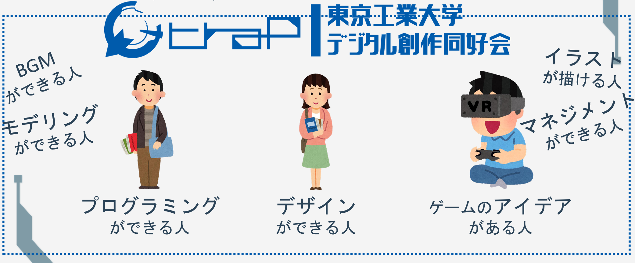 過去のLTの切り出しで恐縮ですが(大学名が古い!),ココは,曲が作れる人,デザインができる人,マネジメントをする人,アイデアがある人,…の集合体です.この「できる」というのは,正確には「興味がある」ということです.