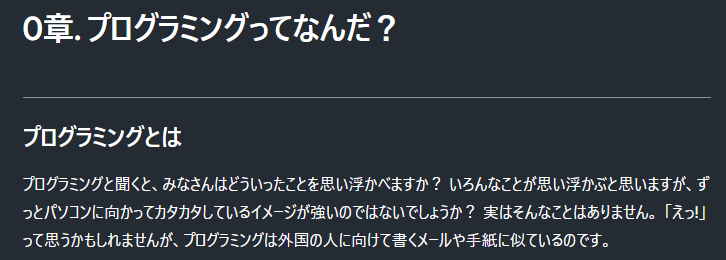 プログラミングとは何かといった概念的な話から始まり、図形の描画やキーボード操作を受け付ける方法など基本的なことを学んだ後、それらを活かして実際のゲームを作るという流れになっています。