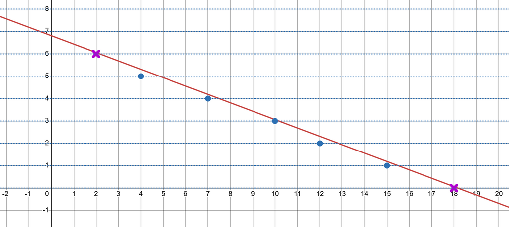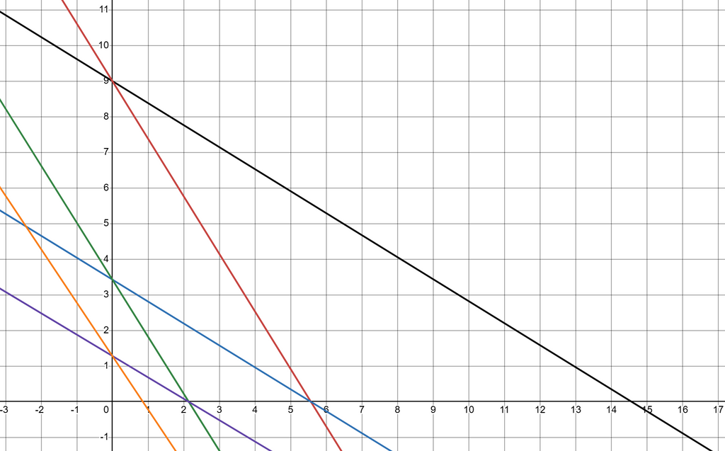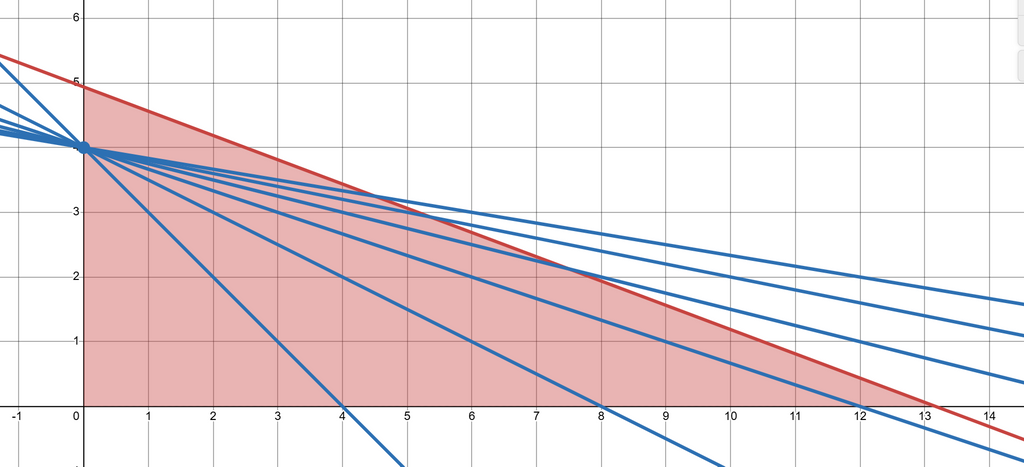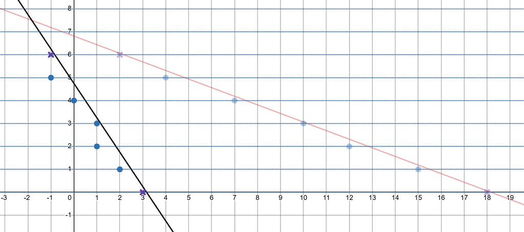 最大化する対象の式は であるので、さらに言い換えると、この問題は、「点 が上記の画像の青い点上のみに存在するとき、 の最大値を求める問題」に帰着させることができます。