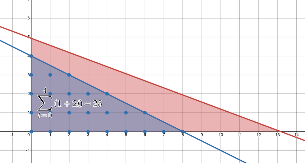 一般の場合、青線は傾き 切片 なので、青線の方程式は となる。したがって、 で固定し、 の範囲で足し合わせることで、総和公式を用いて格子点の個数を計算することができる。