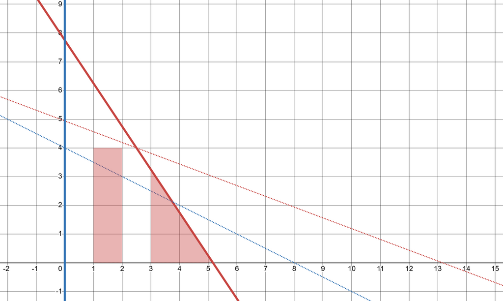 このままでは点の 座標が負になることがあり、扱いづらいため、最も 座標の大きい点の 座標がちょうど になるように 軸方向に平行移動します。上の図では 軸正方向に だけ平行移動することになります。これにより、赤線の方程式は となります。ただし、平行移動を行ったことで、答えとなる の最大値が だけ増加してしまうため、代わりに に を加算しておきます。