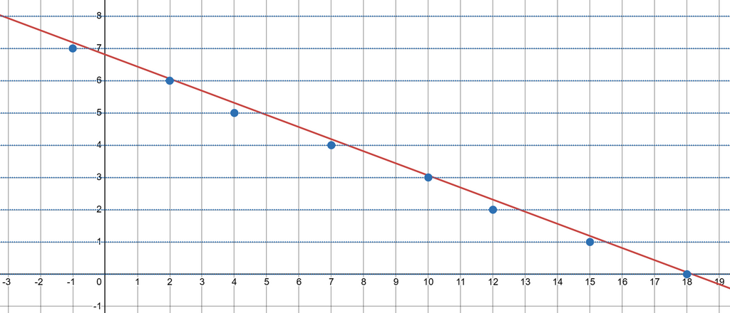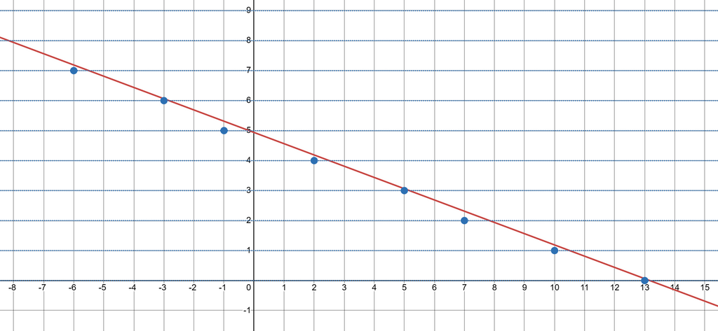 実際に具体的に点 を図示してみると以下のようになります。以下の図は であり、赤線が直線 です。