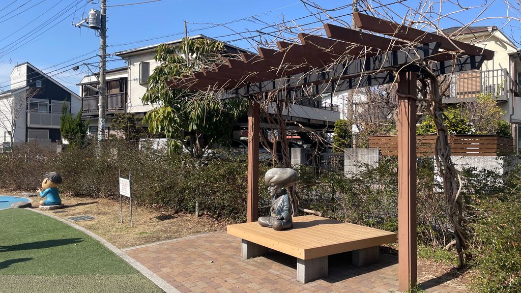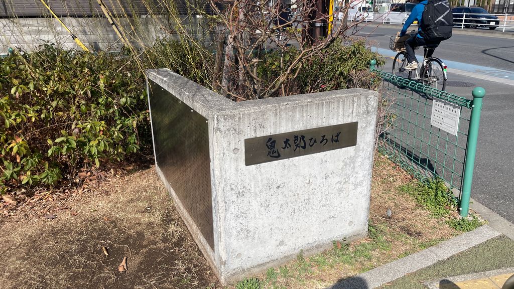 軽く足を休ませたら、さらに先へ。線路の地下区間はまだもう少し続いており、地上には「鬼太郎ひろば」と呼ばれる、妖怪漫画のキャラクターをモチーフにしたオブジェが多く設置された公園が。ここ調布周辺は、漫画家水木しげる先生が長年住んでいた場所であり、そのゆかりでこの広場も設置されているよう。