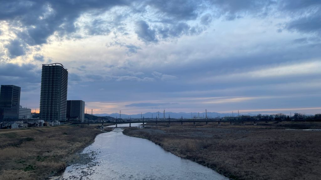 川に向かって左手には大通りの橋(関戸橋)が、右手には京王線の鉄橋と夕陽、そのさらに奥にも特徴的な形状の橋梁(府中四谷橋)がうっすらと。川沿いの景色っていつ見ても美しい。