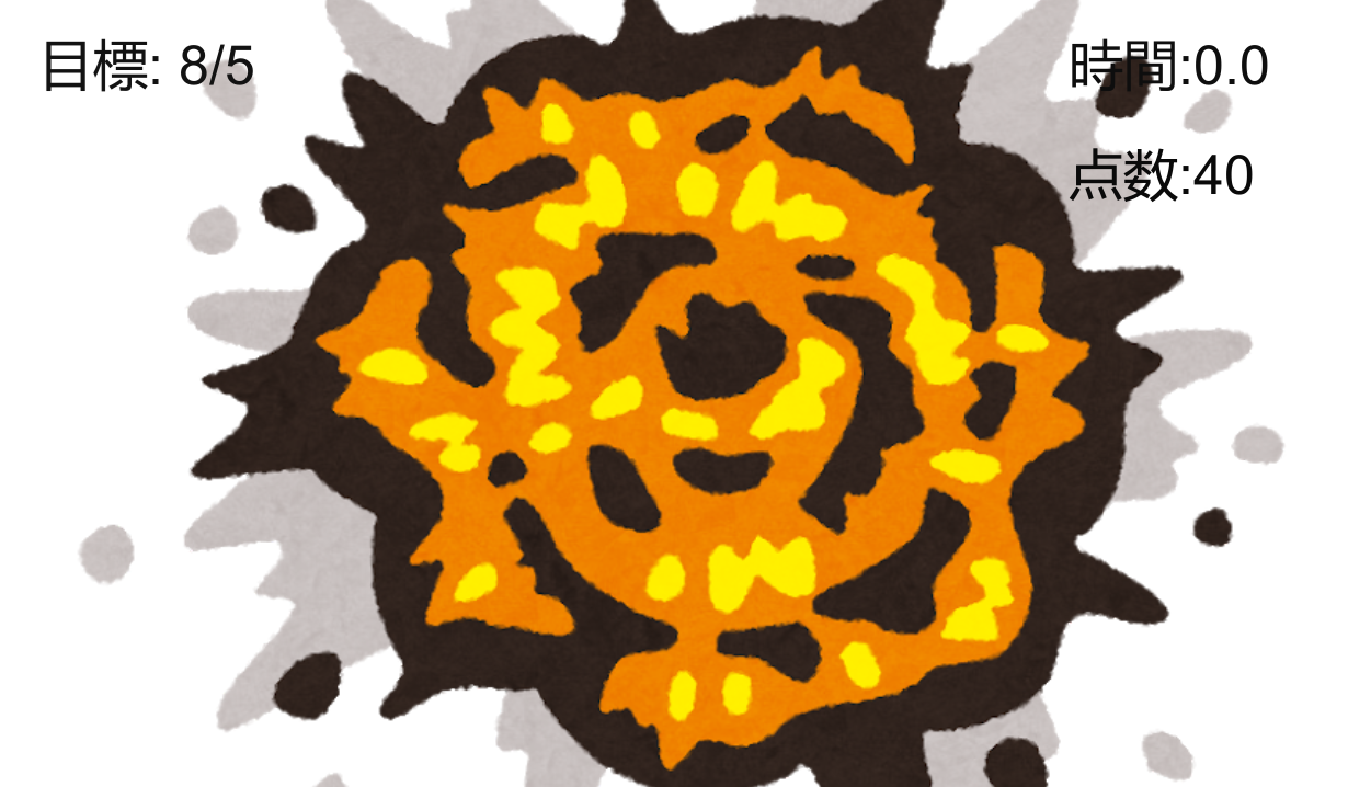 「フェードアウトの演出を入れたいな」と唐突に言い出した事によりフェードアウト演出を実装しようとしましたが、結局爆発の画像を入れるだけにとどまりました。しかし、改めて見るとむしろこっちのほうがよかったなと感じます。